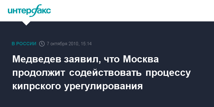 "Я сказал господину президенту (Кипра - ИФ) о том, что позиция РФ остается неизменной - будем всячески способствовать решению этой проблемы для того, чтобы был достигнут результат. Причем, достигнут в спокойном режиме, без каких-либо толчков и избыточных импульсов", - сказал Медведев на совместной с президентом Кипра пресс-конференции в Никосии.