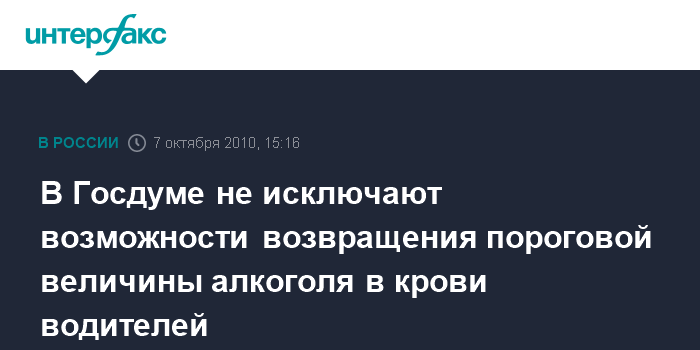 Москва. 7 октября. INTERFAX.RU - Глава думского комитета по безопасности Владимир Васильев считает, что в будущем можно будет вернуться к обсуждению вопроса о возвращении в российское законодательство пороговой величины содержания алкоголя в крови водителей.