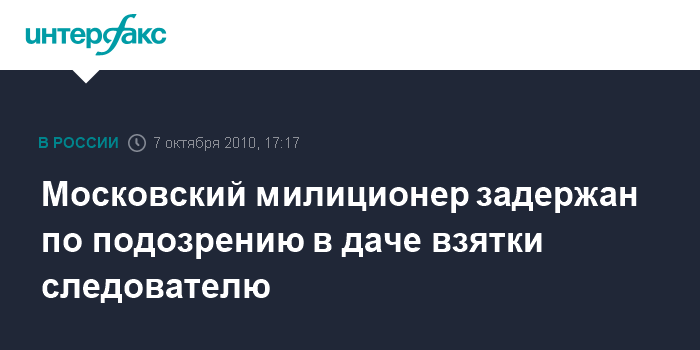 Москва. 7 октября. INTERFAX.RU - В Москве по подозрению в даче взятки задержан заместитель командира отдельного батальона патрульно-постовой службы УВД Южного округа, сообщил "Интерфаксу" в четверг начальник управления информации и общественных связей ГУВД столицы Виктор Бирюков.