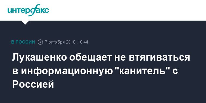 Минск. 7 октября. ИНТЕРФАКС-ЗАПАД - Президент Белоруссии Александр Лукашенко заявил, что не собирается ввязываться в информационный конфликт с российским руководством, сообщили агентству "Интерфакс" в четверг в пресс-службе главы государства.