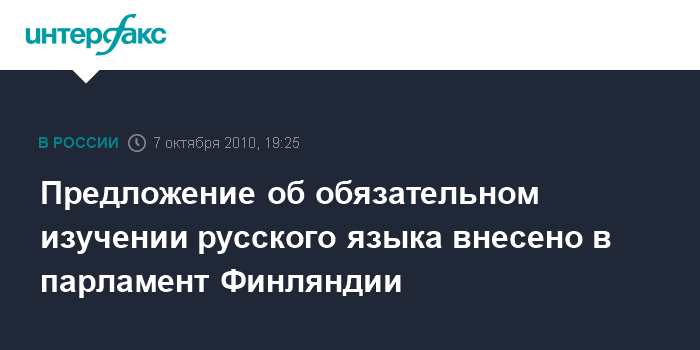 Хельсинки. 7 октября. INTERFAX.RU - Председатель фракции Левого союза Финляндии Анника Лапинтие (Annika Lapintie) внесла в четверг на рассмотрение в Парламент предложение сделать русский язык обязательным для изучения в школах Восточной Финляндии.