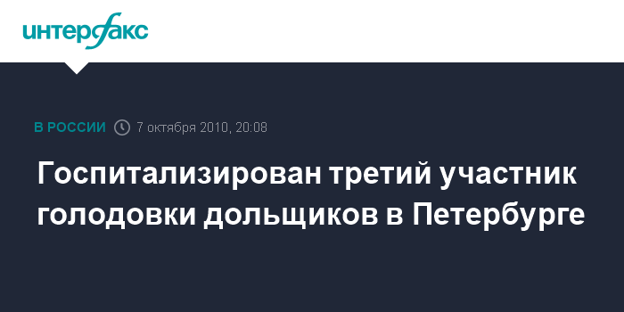 Санкт-Петербург. 7 октября. INTERFAX.RU - Госпитализирована еще одна участница голодовки дольщиков дома 13 по проспекту Пятилеток в Петербурге.