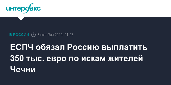 Страсбург. 7 октября. INTERFAX.RU - Европейский суд по правам человека постановил, что Россия должна выплатить около 350 тыс. евро по искам родственников двух уроженцев Чечни Хамзата Мержоева и Али Гастамирова, пропавших без вести, а также пенсионера из Чечни Алаудина Садыкова, подвергшегося пыткам в 2000 г., говорится в пресс-релизе суда, распространенном в четверг.