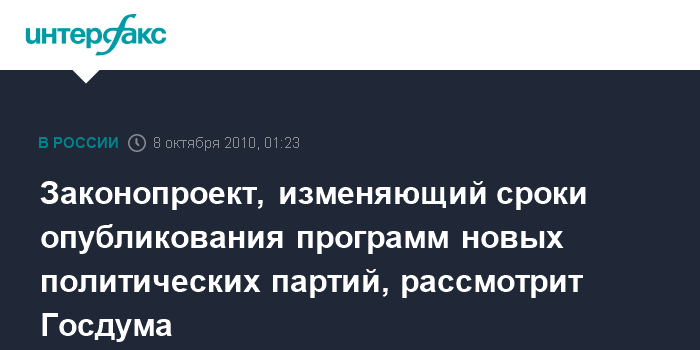 Москва. 8 октября. ИНТЕРФАКС - Госдума в пятницу рассмотрит в первом чтении законопроект, изменяющий сроки опубликования программ новых политических партий.