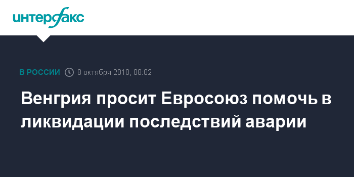 Лондон. 8 октября. INTERFAX.RU - Венгрия обратилась к Европейскому союзу за помощью в преодолении последствий экологической катастрофы, произошедшей в результате аварии на глиноземном заводе, сообщает британская телерадиовещательная корпорация BBC в пятницу.