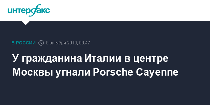 Москва. 8 октября. INTERFAX.RU - В центре столицы в четверг вечером у гражданина Италии злоумышленник угнал автомашину Porsche Cayenne стоимостью 1 млн 600 тыс. рублей, сообщил "Интерфаксу" источник в правоохранительных органах города.