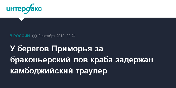 Владивосток. 8 октября. INTERFAX.RU - Пограничники Приморья под конвоем доставили в порт Находка судно под флагом Камбоджи, задержанное накануне по подозрению в браконьерском вылове краба.