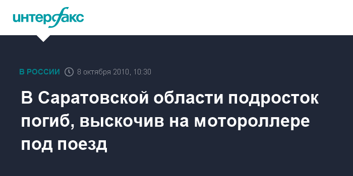 Саратов. 8 октября. INTERFAX.RU - Мотороллер попал под пассажирский поезд в Саратовской области, 16-летний водитель погиб, сообщает отдел пропаганды УГИБДД ГУВД по Саратовской области.