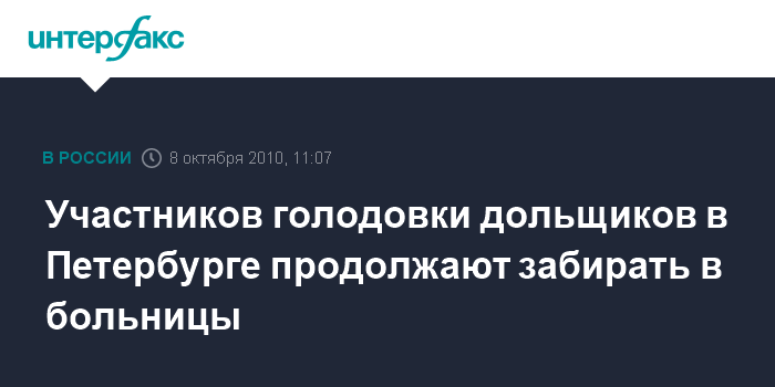 Санкт-Петербург. 8 октября. INTERFAX.RU - В пятницу утром госпитализирован четвертый участник голодовки дольщиков дома 13 по проспекту Пятилеток в Петербурге.