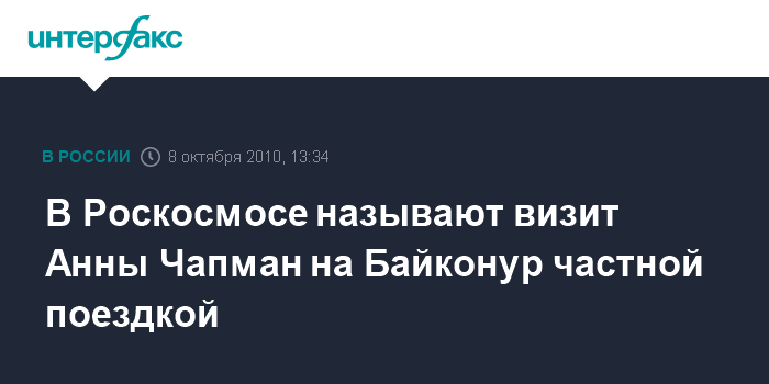 Москва. 8 октября. INTERFAX.RU - Анна Чапман, которую власти США обвинили в шпионаже в пользу России, побывала на запуске корабля "Союз ТМА" с Байконура как частное лицо, сообщили "Интерфаксу" в Роскосмосе.