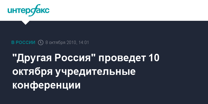 "В Москве 10 октября состоится учредительная конференция московского регионального отделения политической партии "Другая Россия". Кроме того, в этот же день пройдет учредительная конференция регионального отделения по Московской области", - сказал "Интерфаксу" представитель "Другой России" Александр Аверин.