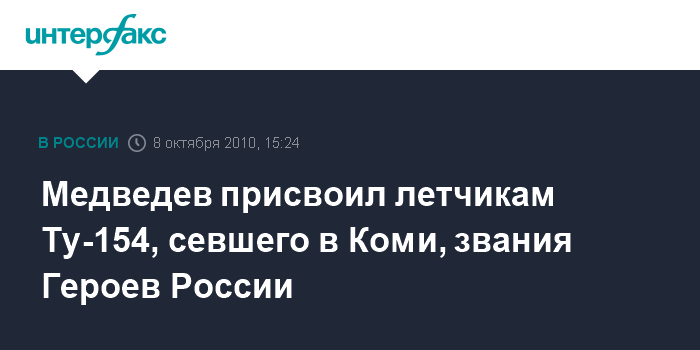 Медведев присвоил летчикам Ту-154, севшего в Коми, звания Героев России