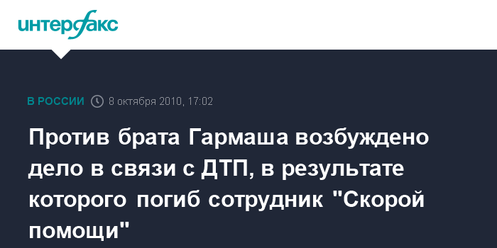 Москва. 8 октября. INTERFAX.RU - По факту дорожно-транспортного происшествия с участием младшего брата известного актера Сергея Гармаша возбуждено уголовное дело.