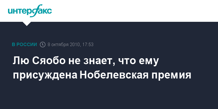 Пекин. 8 октября. INTERFAX.RU - Китайский диссидент Лю Сяобо не знает о том, что стал лауреатом Нобелевской премии мира 2010 года, так как в настоящее время он находится в тюрьме и не имеет связи с внешним миром, сообщили в пятницу в интервью агентству ЭФЭ адвокаты заключенного Мо Шаопин и Пу Чжицян.
