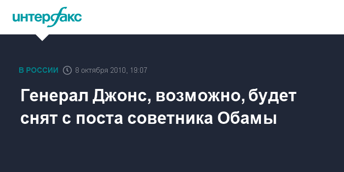 Вашингтон. 8 октября. INTERFAX.RU - Президент США Барак Обама, как ожидается, объявит в пятницу об отставке генерала Джеймса Джонса с поста советника главы государства по вопросам национальной безопасности, сообщает американская газета New York Times со ссылкой на источник в Белом доме.