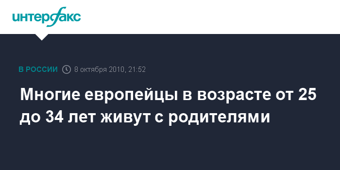 Брюссель. 8 октября. INTERFAX.RU - В странах ЕС каждый третий мужчина и каждая пятая женщина в возрасте от 25 до 34 лет продолжают жить с родителями, говорится в опубликованном в пятницу докладе статистического бюро Евросоюза "Евростат".