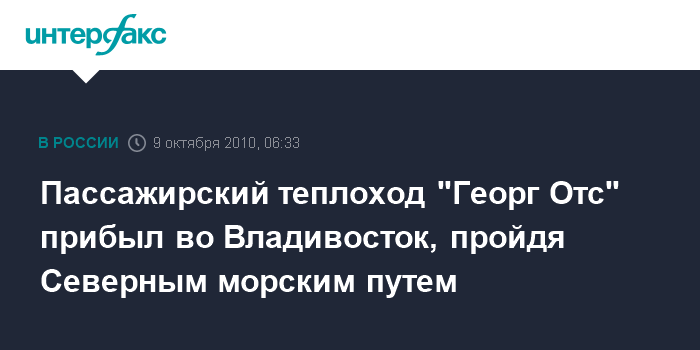 Владивосток. 9 октября. ИНТЕРФАКС - ДАЛЬНИЙ ВОСТОК - Океанский пассажирский паром "Георг Отс" стал первым судном этого класса, которое прошло Северным морским путем из Санкт-Петербурга во Владивосток.