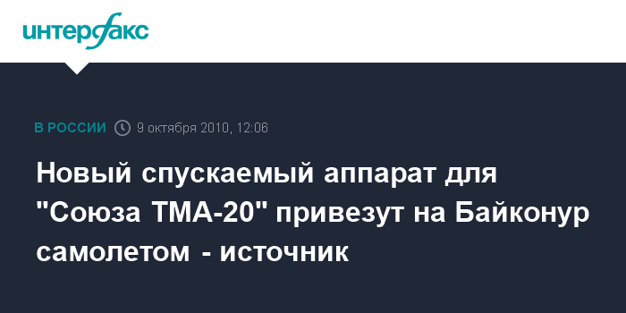 Москва. 9 октября. INTERFAX.RU - Новый спускаемый аппарат для пилотируемого космического корабля "Союз ТМА-20" взамен поврежденного при транспортировке доставят на космодром Байконур самолетом в начале следующей недели. "11-12 октября на самолете на космодром будет привезен спускаемый аппарат от корабля "Союз ТМА-21". Затем таким же способом обратно в Ракетно-космическую корпорацию "Энергия" отправится поврежденный спускаемый аппарат", - сообщил "Интерфаксу-АВН" в субботу источник в ракетно-космической отрасли.