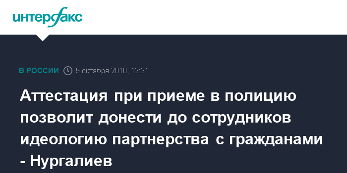 Москва. 9 октября. INTERFAX.RU - Переаттестация сотрудников правоохранительных органов при переходе от милиции к полиции поможет мотивировать личный состав к партнерству во взаимоотношениях с населением, рассчитывает глава МВД РФ Рашид Нургалиев. "Такая мера (переаттестация) вызвана, в первую очередь, новыми требованиями к личному составу, сформулированными в ходе реформы МВД и в рамках подготовки закона "О полиции", - объяснил Р.Нургалиев на церемонии принятия присяги курсантами Университета МВД России.