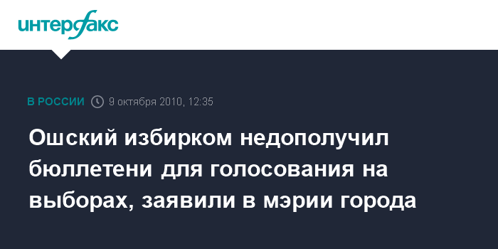 Ош (Киргизия). 9 октября. INTERFAX.RU - Для проведения голосования городской избирательной комиссии Оша не хватает около 2,5 тысяч бюллетеней, сообщили в пресс-служба мэрии Оша. "В процессе подготовке к голосованию мэрией города Ош было установлено, что для голосования городской избирательной комиссии не хватает около 2,5 тысяч бюллетеней", - сказали в пресс-службе мэрии "Интерфаксу" в субботу. По ее данным, "уведомления о нехватке бюллетеней уже направлены в администрацию президента Киргизской Республики и Центризбирком".