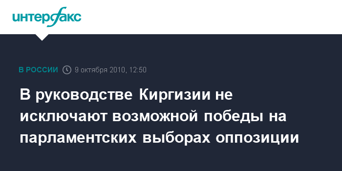 Бишкек. 9 октября. INTERFAX.RU - В руководстве Киргизии не исключают возможной победы на парламентских выборах 10 октября оппозиционных партий, но заявляют, что население поддерживает действующие власти. "В условиях демократичных выборов возможен любой исход и могут победить партии, которые не принимают итоги 7 апреля (привели к смене власти в Киргизии - ИФ) и конституционного референдума", - заявил "Интерфаксу" руководитель администрации президента Киргизии Эмиль Каптагаев.