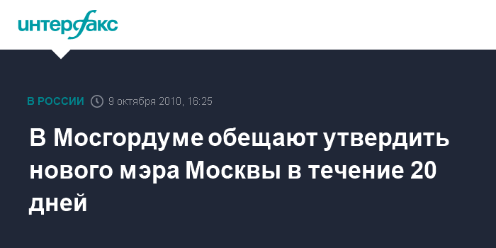Москва. 9 октября. INTERFAX.RU - Кандидатуру нового мэра Москвы Мосгордума рассмотрит не позднее, чем через 20 дней, сообщил "Интерфаксу" в субботу спикер Мосгордумы Владимир Платонов. "После того, как президенту РФ Дмитрию Медведеву представили четыре кандидатуры на пост нового мэра Москвы, у него есть 10 дней на то, чтобы внести одну из них в Мосгордуму. Затем в течение 10 дней депутаты Московской городской думы рассматривают эту кандидатуру на заседании", - пояснил он.