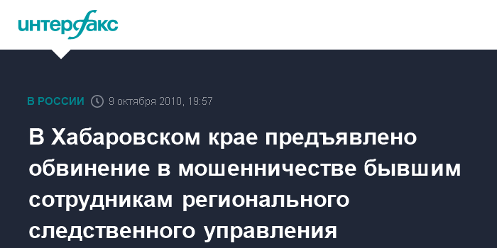 Москва. 9 октября. ИНТЕРФАКС - Следственным управлением Следственного комитета по Дальневосточному федеральному округу предъявлено обвинение в мошенничестве бывшим сотрудникам следственного управления по Хабаровскому краю, сообщает официальный сайт СКП РФ в субботу.