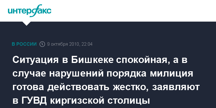 Бишкек. 9 октября. ИНТЕРФАКС - Милиция столицы Киргизии готова жестко пресекать любые провокации и беспорядки в день голосования на парламентских выборах, заявили "Интерфаксу" в субботу в пресс-службе Главного управления внутренних дел Бишкека.