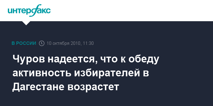 Москва. 10 октября. INTERFAX.RU - Глава ЦИК РФ Владимир Чуров отмечает низкую активность избирателей на выборах в Дагестане. "К сожалению, активность избирателей небольшая. Проголосовало примерно 5% избирателей", - сообщил В.Чуров по телемосту с Центризбиркомом из Дербента. По его словам, в отличие от прошлогодних выборов в республике проблем с открытием участков для голосования не было. "Мы уже объехали больше трети участков, и все они в отличие от ситуации год назад открыты", - сказал председатель ЦИК. "В целом сейчас обстановка спокойная. Надеюсь, что ближе к обеду активность избирателей повысится", - сказал В.Чуров.
