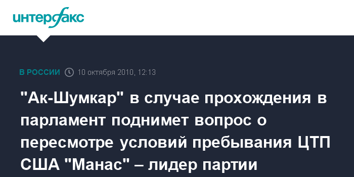 Бишкек. 10 октября. INTERFAX.RU - Представители одной из киргизских партии, участвующей в парламентских выборах, намерены в случае своего успеха пересмотреть условия пребывания американской авиабазы "Манас" на территории республики. "Я заявил послу США в Киргизии Татьяне Гфеллер на последний нашей встрече, что мы намерены пересмотреть условия пребывания их базы на территории Киргизии", - сказал "Интерфаксу" лидер партии "Ак-Шумкар" Темир Сариев.