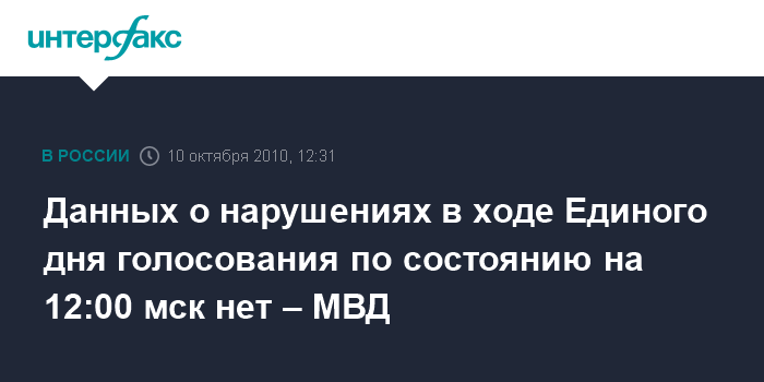 Москва. 10 октября. INTERFAX.RU - В МВД России пока не поступала информация о каких-либо инцидентах, связанных с процедурой голосования в регионах страны 10 октября, сообщили в пресс-центре ведомства. "По состоянию на 12:00 мск пресс-центр не располагает данными о нарушениях общественного порядка на избирательных участках", - заявили "Интерфаксу" в воскресенье. Около 8 тыс. выборов различного уровня проходят 10 октября России в рамках Единого дня голосования, в том числе выборы в парламенты шести регионов.