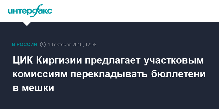 Бишкек. 10 октября. INTERFAX.RU - Центризбирком Киргизии изучил поступающие сигналы о быстрой наполняемости урн на избирательных участках и принял решение перекладывать содержимое в мешки, опечатывать их и продолжать процесс голосования, заявила журналистам в воскресение член ЦИК Киргизии Жаркын Бапанова. Она сказала, что перекладывание бюллетеней из урн для голосования в мешки "будет проходить в присутствии наблюдателей, в каждом случае должен быть заполнен протокол и поставлены подписи членов комиссии на местах".