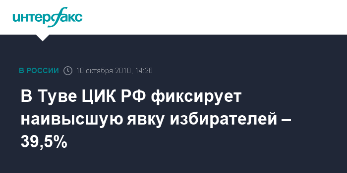 Москва. 10 октября. INTERFAX.RU - Явка избирателей на выборах в региональные законодательные органы власти, по последним данным, составила от 16,9% до 39,5%, сообщил замглавы Центризбиркома РФ Леонид Ивлев. "По данным на 14:00 по московскому времени самую высокую явку избирателей можно наблюдать в Республике Тыва, здесь средний показатель достиг 39,5%", - сказал Л.Ивлев.