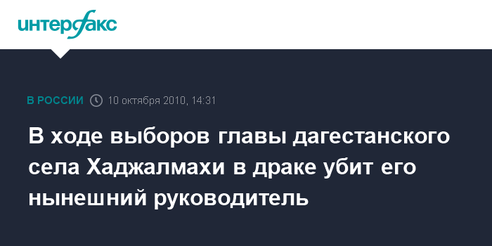 Махачкала. 10 октября. INTERFAX.RU - В селении Хаджалмахи Левашинского района Дагестана в ходе проведения выборов главы муниципального образования произошла массовая драка с применением огнестрельного оружия, сообщили "Интерфаксу" в пресс-службе МВД Дагестана. "Инцидент произошел приблизительно в 14 часов. В драке принимали участие несколько десятков человек, несколько получили огнестрельные ранения, скончался глава муниципального образования Хаджалмахи Абулмуслим Нурмагомедов", - сообщил представитель пресс-службы МВД.
