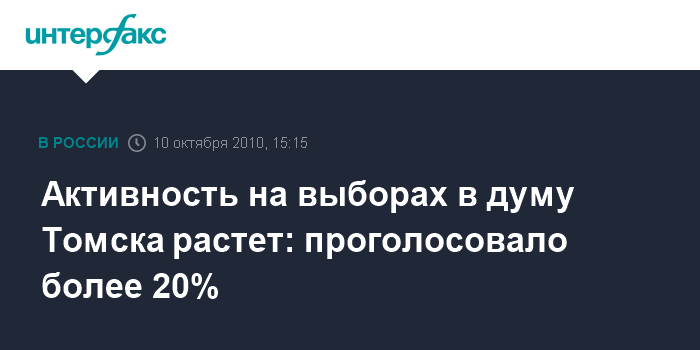 Томск. 10 октября. INTERFAX.RU - Свои голоса за кандидатов в Думу города Томска по состоянию на 15:00 местного времени отдали 22,58% избирателей. Председатель избирательной комиссии Томской области Эльман Юсубов сообщил журналистам, что активность томичей остается на уровне выборов 2005 года. "Явка пять лет назад, но на 14:00, я обращаю ваше внимание, составляла около 18%. Эти 4 с лишним процента - из-за разницы во времени", - пояснил Э.Юсубов.