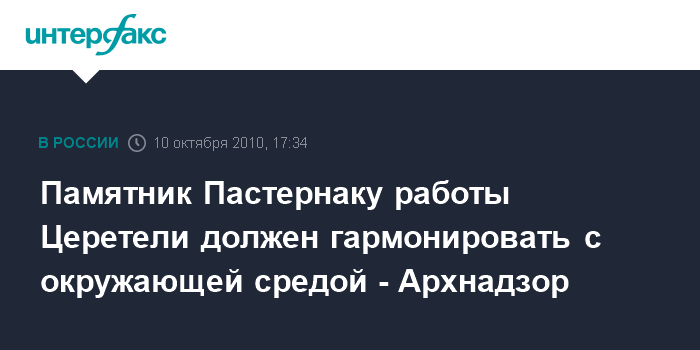 Москва. 10 октября. INTERFAX.RU - Памятник Борису Пастернаку работы Зураба Церетели, который может быть установлен напротив Храма Христа Спасителя, должен гармонировать с окружающей средой, заявляют в "Архнадзоре". "Никто не говорит, что все, что делает Церетели, однозначно плохо. Вопрос в том, насколько памятники удачно привязаны к месту", - сказала координатор движения "Архнадзор" Наталья Самовер "Интерфаксу" в воскресенье.
