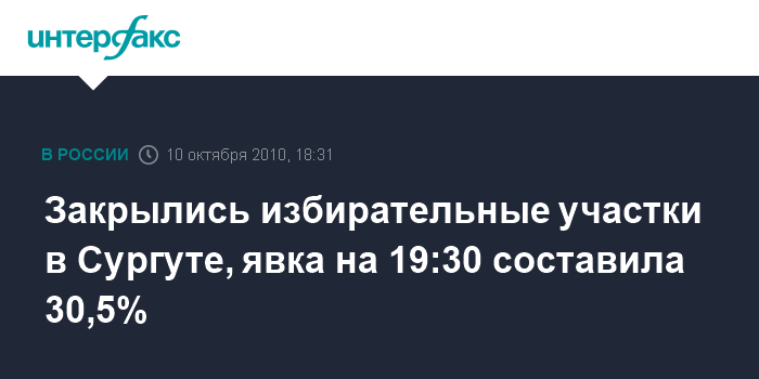 Ханты-Мансийск. 10 октября. INTERFAX.RU - В Сургуте (ХМАО) завершилось голосование на выборах главы города, по предварительным данным на 19:30, явка составила 30,5%, что ниже, чем на прошлых выборах. Как сообщили агентству "Интерфакс-Урал" в территориальной избирательной комиссии, при проведении голосования поступило несколько жалоб. "Все обращения носили несущественный характер, в целом выборы прошли очень спокойно".