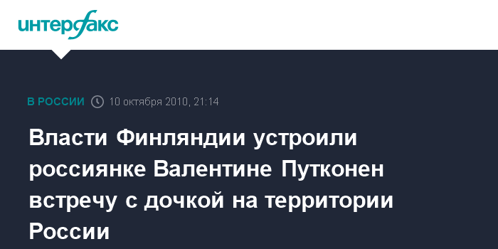 Хельсинки. 10 октября. ИНТЕРФАКС - Органы социальной опеки и министерства иностранных дел Финляндии разрешили россиянке Валентине Путконен (Putkonen) встретиться с 10-летней дочкой Юлией на территории России.