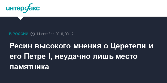 "Сам памятник мне нравится, и я высокого мнения о его авторе - Зурабе Церетели", - заявил В.Ресин в программе "Нереальная политика" на телеканале НТВ.