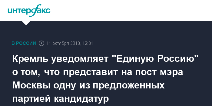 Кремль уведомляет "Единую Россию" о том, что представит на пост мэра Москвы одну из предложенных партией кандидатур