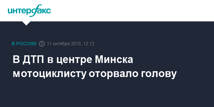Минск. 11 октября. INTERFAX.RU - Во время ДТП, которое произошло в центре Минска, мотоциклисту оторвало голову, сообщили агентству "Интерфакс-Запад" в понедельник в ГАИ Минска.