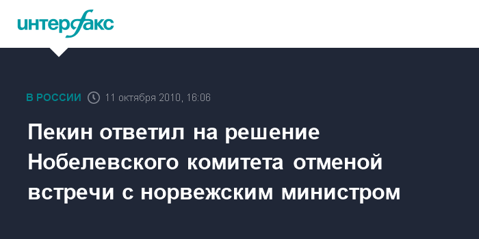 Лондон. 11 октября. INTERFAX.RU - Власти КНР отменили встречу с министром рыболовной промышленности Норвегии в связи с решением Нобелевского комитета присудить в этом году премию мира китайскому правозащитнику Лю Сяобо, сообщила в понедельник телерадиокорпорация BBC со ссылкой на МИД Норвегии.