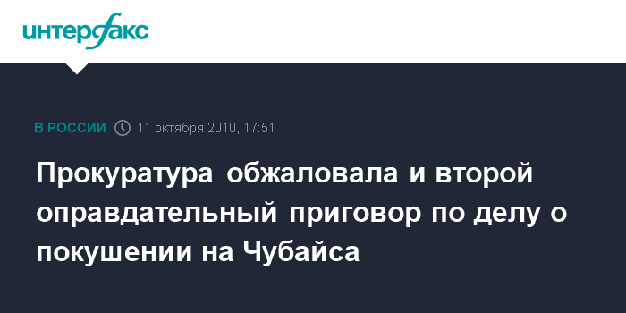 Москва. 11 октября. INTERFAX.RU - Прокуратура обжаловала оправдательный приговор по делу о покушении на экс-главу РАО ЕЭС Анатолия Чубайса, совершенном в 2005 году в Подмосковье.
