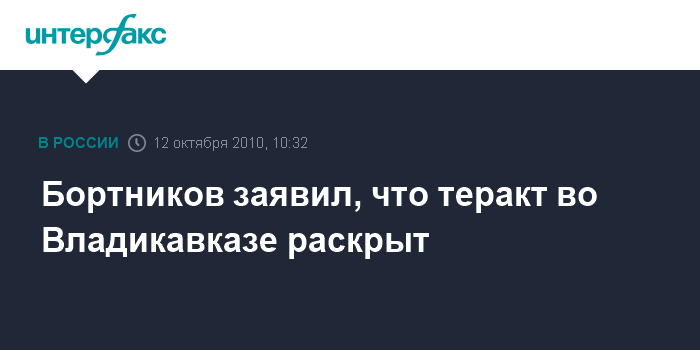 Москва. 12 октября. INTERFAX.RU - Директор ФСБ России Александр Бортников сообщил о раскрытии теракта, совершенного в этом году на центральном рынке Владикавказа.