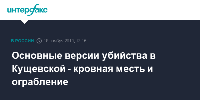 Москва. 18 ноября. INTERFAX.RU - Следствие отрабатывает две основных версии массового убийства в станице Кущевской на Кубани - кровная месть и разбойное нападение с целью захвата большой суммы денег, заявил глава СКП Александр Бастрыкин.