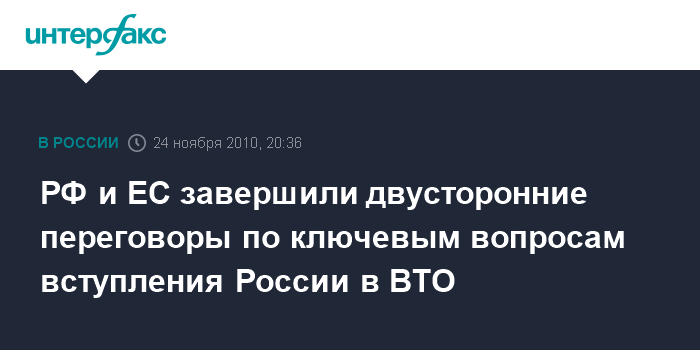 Брюссель. 24 ноября. INTERFAX.RU - Россия и ЕС завершили двусторонние переговоры по ключевым вопросам, касающимся вступления РФ в ВТО, говорится в заявлении Еврокомиссии.