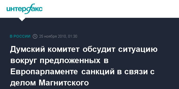 Москва. 25 ноября. ИНТЕРФАКС - Комитет Госдумы по международным делам планирует рассмотреть вопрос, связанный с рекомендациями профильного комитета Европарламента о введении санкций против российских чиновников, которые якобы причастны к смерти в СИЗО юриста Hermitage Capital Сергея Магнитского.