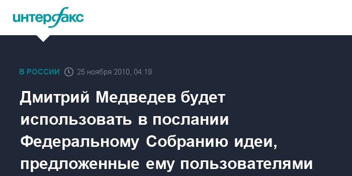 Москва. 25 ноября. ИНТЕРФАКС - Президент России Дмитрий Медведев не исключает, что в послании Федеральному Собранию будут задействованы идеи и тезисы, которыми с ним делятся пользователи Твиттера.