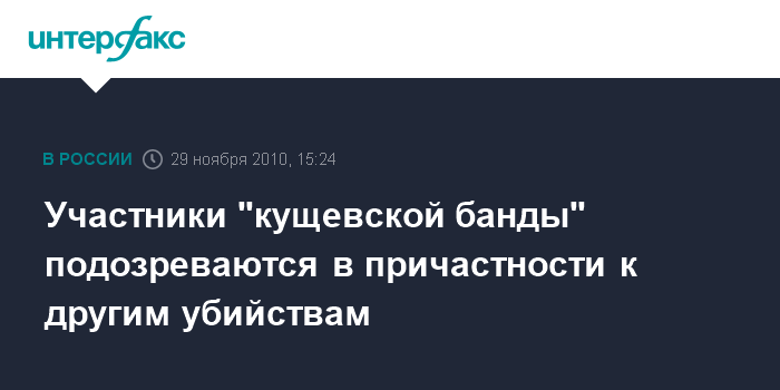 Москва. 29 ноября. INTERFAX.RU - Участники банды, обвиняемые в массовом убийстве в станице Кущевская Краснодарского края, подозреваются в причастности еще к ряду тяжких преступлений, сообщил "Интерфаксу" официальный представитель СК РФ Владимир Маркин.