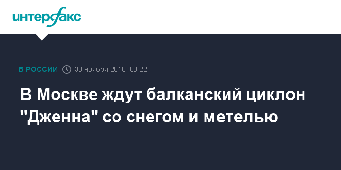 Москва. 30 ноября. INTERFAX.RU - Синоптики обещают днем во вторник в столице снег и метель с порывистым ветром, которые принесет балканский циклон "Дженна".